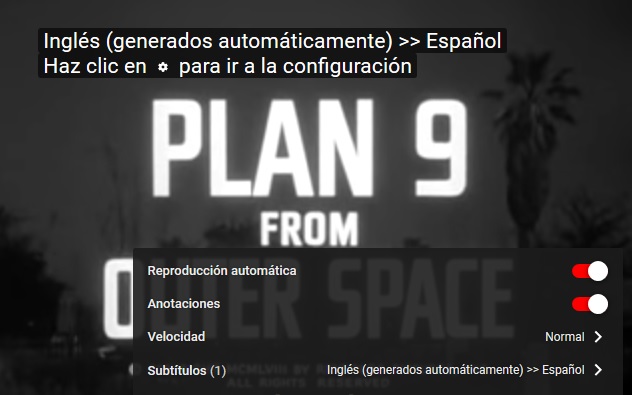 Al activar esta opción, se generarán por defecto los subtítulos automáticos para el vídeo en el idioma original de la película, habitualmente en inglés. Para poner los subtítulos en español a cualquier película o documental, accedemos al icono de "configuración" del propio vídeo, y en el menú que se despliega seleccionamos la opción "Subtítulos" y "traducir automáticamente".